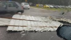 Пожарникари на терен го расчистуваа хаосот од невремето во скопски Аеродром. Дел од лимот кој падна од крв од зграда...