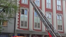 Уште едно возило дојде на помош на пожарникарите кои се обидуваат да го изгаснат огнот кој ги зафати горните катови...