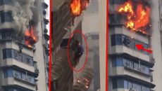 Снимката од станбена зграда во која избил пожар и човекот кој виси на 23-тиот кат во обид да се спаси, никого нема...