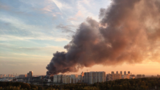 Пожар избувна во преполн маркет за градежен материјал северозападно од Москва. Црн чад може да се види како се...