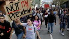 Околу 300 лица организираа протест во Балтимор извикувајќи „Тоа не е мојот претседател!“ а на транспарентот пишуваше...