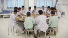 Дванаесетте тајландски деца и нивниот тренер ја напуштија болницата на пат за прес-конференција, која ќе ја гледа...