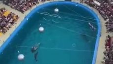 Посетителите на Делфинаруимот во градот Одеса, Украина, беа сведоци на раѓањето на делфинче. На аматерска снимка...