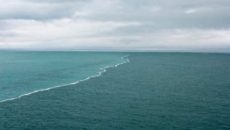 Фотографијата го покажува местото каде што се сретнуваат два океана во заливот Алјаска. Иако фотографијата е...