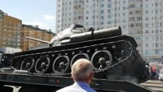 На воена парада во рускиот град Курск се случи инцидент во кој еден од тенковите што парадираа се лизна од камионот...