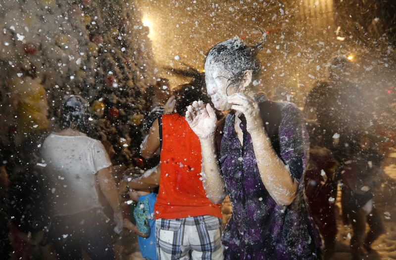 Децата си играат во пена која симулира снег пред трговски центар како дел од Божикните прослави во Сингапур. Фото:...