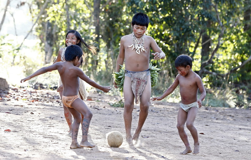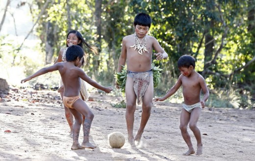 epa04259849 Tatuyo tribe Indian and children of Amazon play soccer on Tupe village in Amazon, some 35km northwest of Manaus, Brazil, 15 June 2014. The FIFA World Cup 2014 in Brazil is running from 12 June to 13 July 2014. EPA/JEON HEON-KYUN