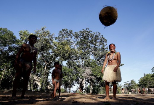 epa04259829 Tatuyo tribe Indian and children of Amazon play soccer on Tupe village in Amazon, some 35km northwest of Manaus, Brazil, 15 June 2014. The FIFA World Cup 2014 in Brazil is running from 12 June to 13 July 2014. EPA/JEON HEON-KYUN