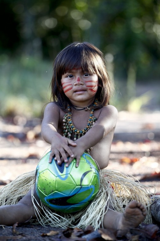 epa04259847 Tatuyo tribe Indian child of Amazon sits with ball on Tupe village in Amazon, some 35km northwest of Manaus, Brazil, 15 June 2014. The FIFA World Cup 2014 in Brazil is running from 12 June to 13 July 2014. EPA/JEON HEON-KYUN