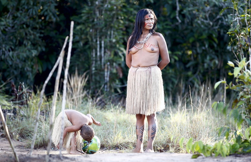 epa04259848 Tatuyo tribe indian child of Amazon play with ball as his mother stand on Tupe village in Amazon, some 35km northwest of Manaus, Brazil, 15 June 2014. The FIFA World Cup 2014 in Brazil is running from 12 June to 13 July 2014. EPA/JEON HEON-KYUN