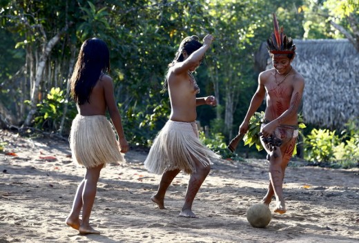epa04259850 Tatuyo tribe Indian and children of Amazon play soccer on Tupe village in Amazon, some 35km northwest of Manaus, Brazil, 15 June 2014. The FIFA World Cup 2014 in Brazil is running from 12 June to 13 July 2014. EPA/JEON HEON-KYUN