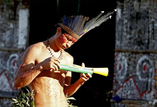 epa04259852 A Tatuyo tribe Indian of Amazon looks a bubuzela on Tupe village in Amazon, some 35km northwest of Manaus, Brazil, 15 June 2014. The FIFA World Cup 2014 in Brazil is running from 12 June to 13 July 2014. EPA/JEON HEON-KYUN