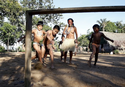 epa04259824 Tatuyo tribe Indian and children of Amazon play soccer on Tupe village in Amazon, some 35km northwest of Manaus, Brazil, 15 June 2014. The FIFA World Cup 2014 in Brazil is running from 12 June to 13 July 2014. EPA/JEON HEON-KYUN