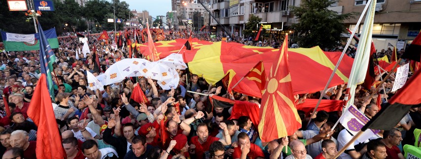 Members of the ruling VMRO DPMNE wave Macedonian and party flags and shout the slogans during the meeting for support to the government in Skopje, The Former Yugoslav Republic of Macedonia on 18 May 2015.After the big opposition meeting yesterday in Skopje when oppositions ask for resignations of the government, ruling VMRO DPMNE organized big meeting to support the government and actual Prime Minister Nikola Gruevski.Tens thousands people attend to the meeting.