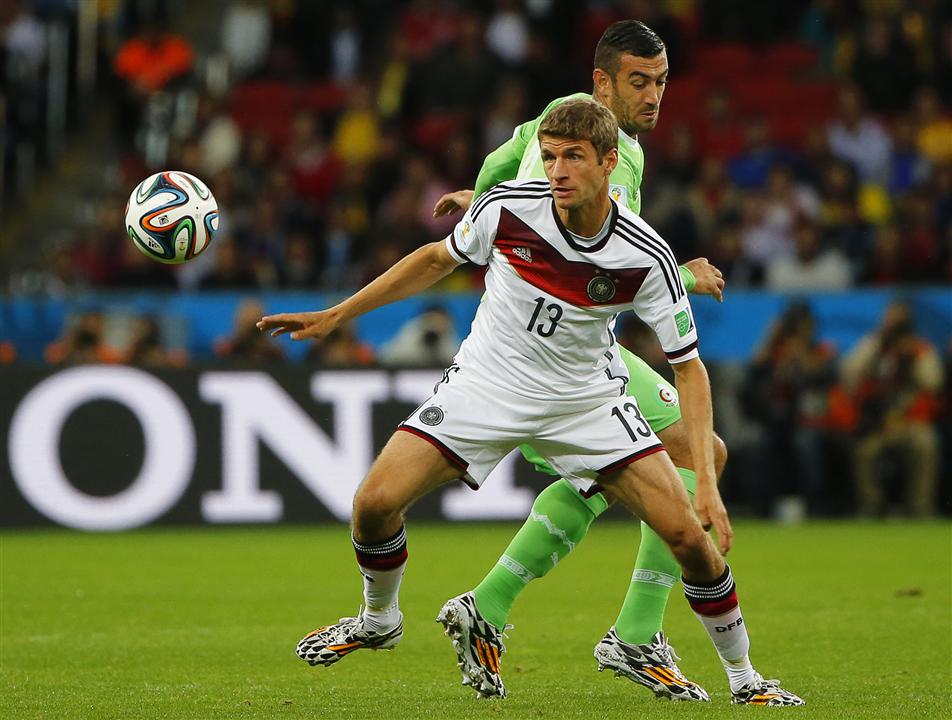 epa04292447 Thomas Mueller (front) of Germany in action against Essaid Belkalem (back) of Algeria during the FIFA World Cup 2014 round of 16 match between Germany and Algeria at the Estadio Beira-Rio in Porto Alegre, Brazil, 30 June 2014.