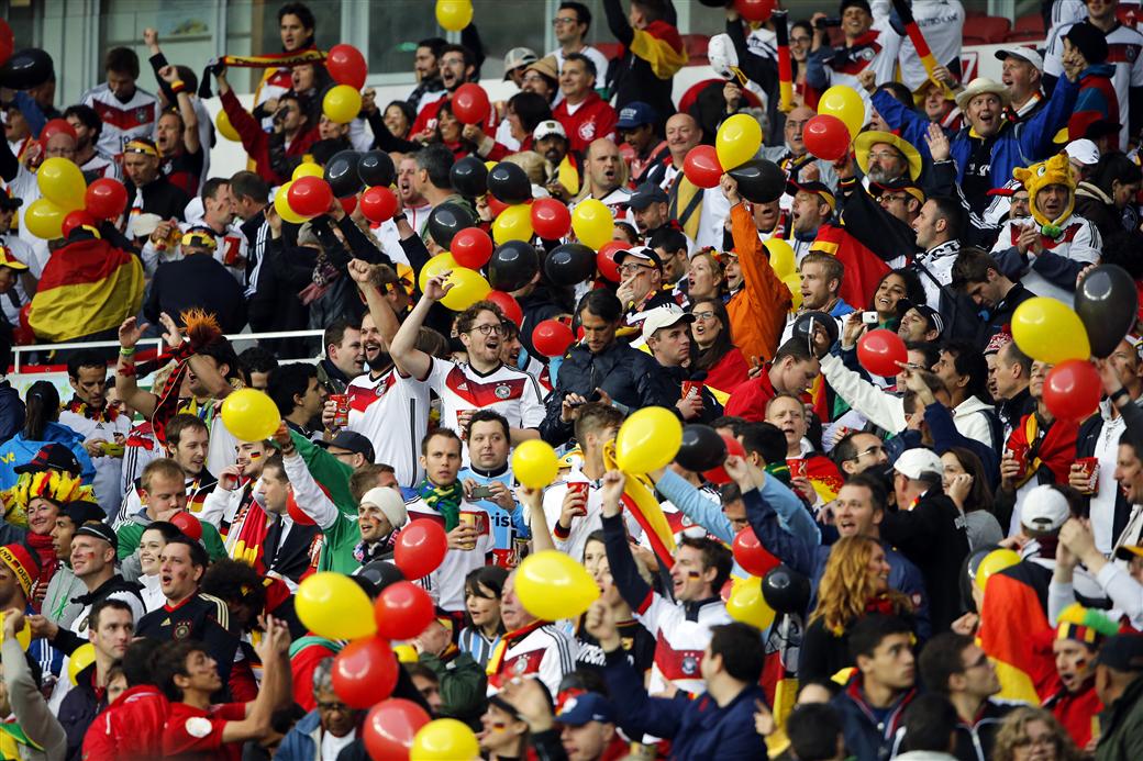 epa04292420 German fans cheer for their team before the FIFA World Cup 2014 round of 16 match between Germany and Algeria at the Estadio Beira-Rio in Porto Alegre, Brazil, 30 June 2014.