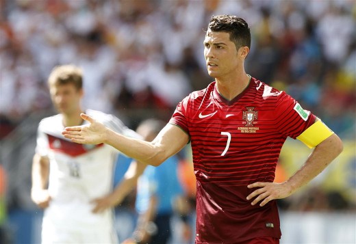 epa04261675 Portugal’s Cristiano Ronaldo reacts during the FIFA World Cup 2014 group G preliminary round match between Germany and Portugal at the Arena Fonte Nova in Salvador, Brazil, 16 June 2014.