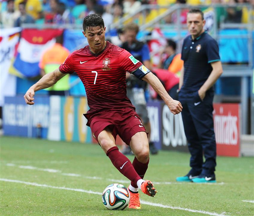 epa04261686 Portuguese forward Cristiano Ronaldo in action watched by his coach Paulo Bento FIFA World Cup 2014 group G preliminary round match between Germany and Portugal at the Arena Fonte Nova in Salvador, Brazil, 16 June 2014.