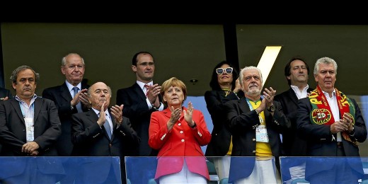 epa04261478 UEFA President French Michel Platini (L-R), FIFA President Swiss Sepp Blatter, German Chancellor Angela Merkel, governor of federal state Bahia Jaques Wagner, and Portuguese Minister of the Presidency and Parliamentary Affairs Luis Marques Guedes clap on the stands prior the FIFA World Cup 2014 group G preliminary round match between Germany and Portugal at the Arena Fonte Nova in Salvador, Brazil, 16 June 2014.