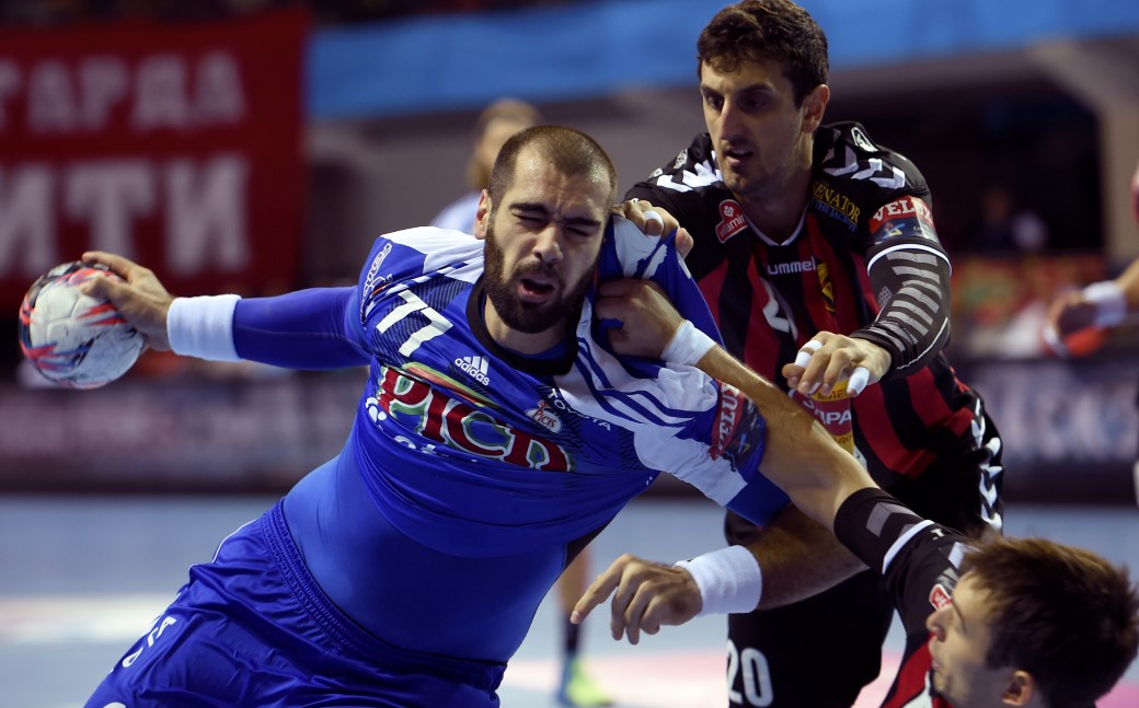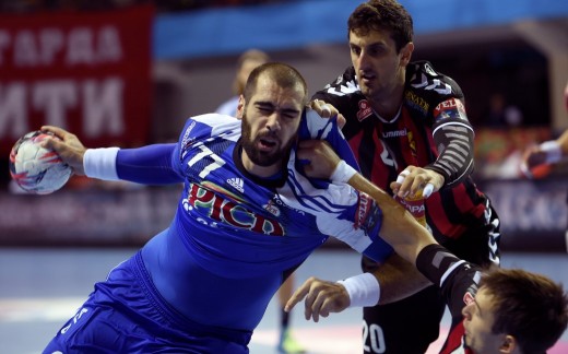 Vladimir Vranjes (L) of MOL-Pick Szeged tries to score against HC Vardar players Ilija Abutovic (C) and Igor Karacic (R) during the EHF Champions league match, in Skopje , The Former Yugoslav Republic of Macedonia on 27 September 2015