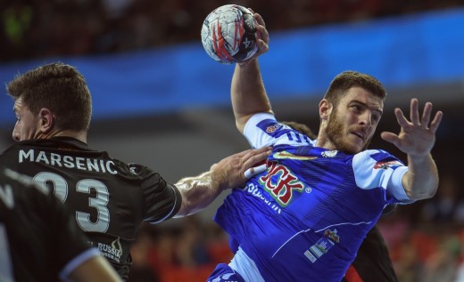 Elizaga Niko Mindegia (L) of MOL-Pick Szeged tries to score against HC Vardar player Mijajlo Marsenic (L) during the EHF Champions league match, in Skopje , The Former Yugoslav Republic of Macedonia on 27 September 2015