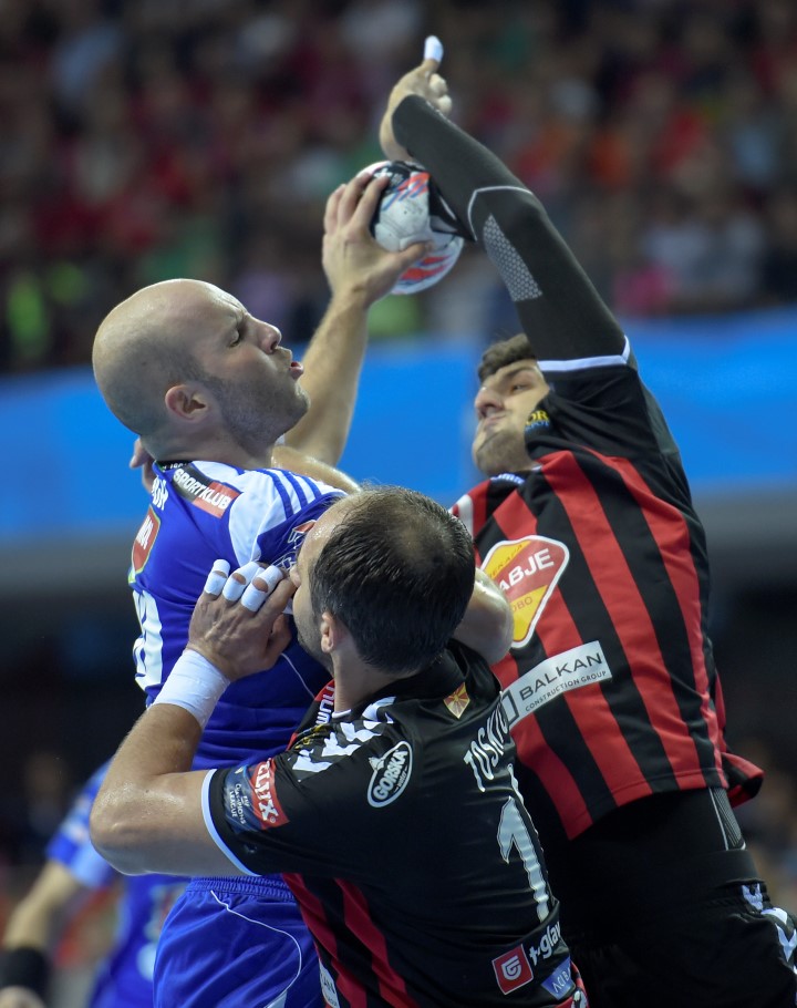 Zsolt Balogh (L) of MOL-Pick Szeged tries to score against HC Vardar players Alen Toskic (C) and Ilija Abutovic (R) during the EHF Champions league match, in Skopje , The Former Yugoslav Republic of Macedonia on 27 September 2015