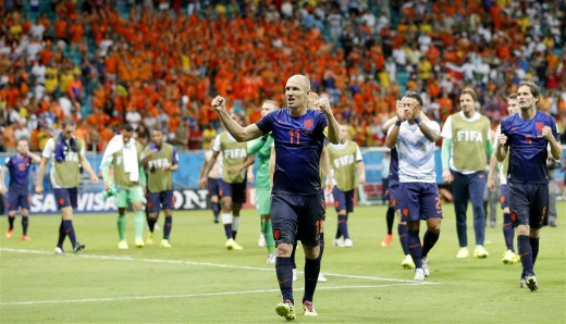 epa04254858 Arjen Robben (C) of the Netherlands celebrates with teammates after the final whistle of the FIFA World Cup 2014 group B preliminary round match between Spain and the Netherlands at the Arena Fonte Nova in Salvador, Brazil, 13 June 2014.