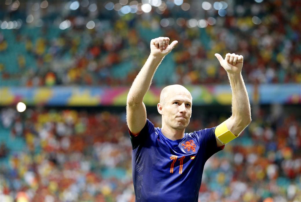 epa04254853 Arjen Robben of the Netherlands celebrates after the final whistle of the FIFA World Cup 2014 group B preliminary round match between Spain and the Netherlands at the Arena Fonte Nova in Salvador, Brazil, 13 June 2014.