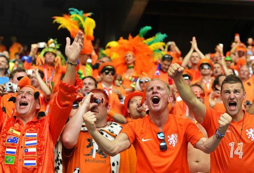 epa04254720 Supporters of the Netherlands celebrate the 1-1 goal during the FIFA World Cup 2014 group B preliminary round match between Spain and the Netherlands at the Arena Fonte Nova in Salvador, Brazil, 13 June 2014.