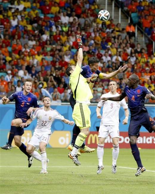 epa04254765 Robin van Persie (C-R) of the Netherlands goes for a header next to Goalkeeper Iker Casillas of Spain during the FIFA World Cup 2014 group B preliminary round match between Spain and the Netherlands at the Arena Fonte Nova in Salvador, Brazil, 13 June 2014.