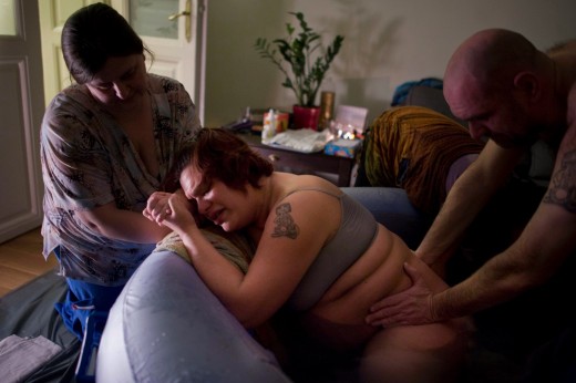 epa04183642 (08/16) Peter (R) massages the waist of her wife, Eve, who is suffering from parturient, in a special inflatable basin during their home birth process in their apartment in Budapest, Hungary, early 20 February 2014. From left midwife Monika Schanda assists. Eve and her husband Peter decided to choose the home birth option with their first common child. In Hungary the law on regulating home birth has been in force since May 2011 and it is focused on the midwives? regulations as they are required to have a registered license, a certificate and a medical insurance in order to practice. The home birth is not financed by the official health insurance system in Hungary and has a fixed price that covers all the services that maternity requires. EPA/BEA KALLOS HUNGARY OUT;Upon the request of the family, the pictures are not distributed directly after the birth, and either the precise identification of the family members? full name or of the venue remain unstated. PLEASE REFER TO ADVISORY NOTICE (epa04183634)