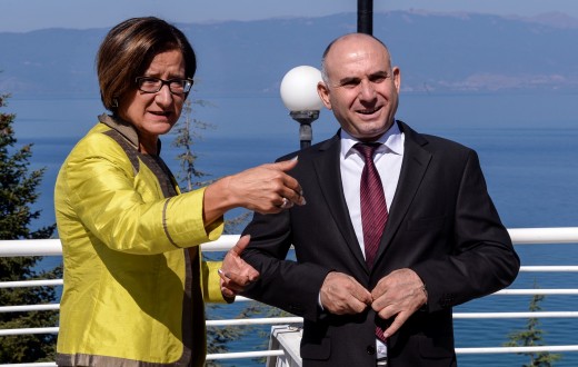 Interior Minister of Austria Johanna Mikl¬Leitner (L) talks with Macedonian Interior minister Mitko Cavkov (R) during their meeting in Ohrid, The Former Yugoslav Republic of Macedonia on 04 September 2015. Interior ministers of Austria, Hungary, Serebia and Macedonia meet in Ohrid to sign a memorandum of understanding.