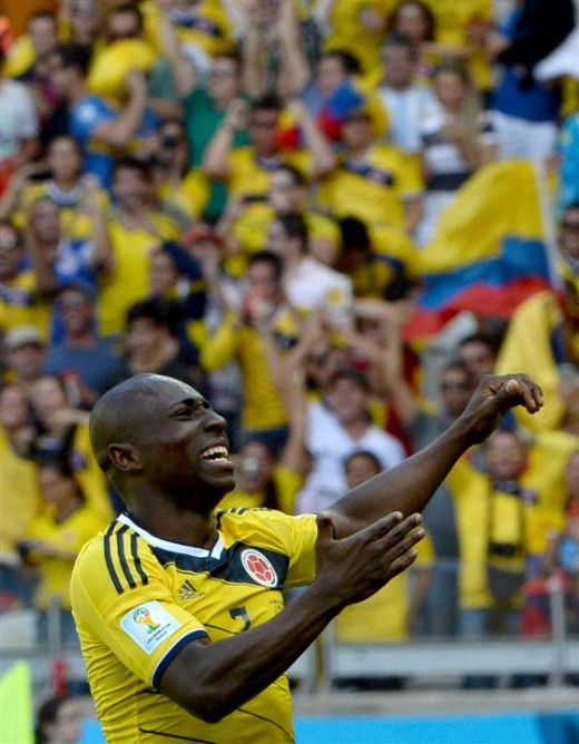 epa04256205 Pablo Armero of Colombia celebrates after scoring the opening goal during the FIFA World Cup 2014 group C preliminary round match between Colombia and Greece at the Estadio Mineirao in Belo Horizonte, Brazil, 14 June 2014.