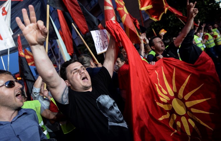 Member of the ruling VMRO DPMNE ,dressed in the T-short with the face of Russian President Vladimir Putin, shows the sign of United Macedonia during the meeting for support to the government in Skopje, The Former Yugoslav Republic of Macedonia on 18 May 2015.After the big opposition meeting yesterday in Skopje when oppositions ask for resignations of the government, ruling VMRO DPMNE organized big meeting to support the government and actual Prime Minister Nikola Gruevski.Tens thousands people attend to the meeting.