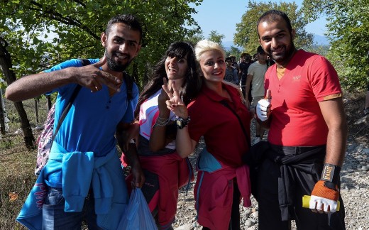 Happy migrants react after they leave the registration camp and walk toward the busses bound for Serbia, in city of Gevgelija, The Former Yugoslav Republic of Macedonia, 13 September 2015. The border-crossing trip between Gevgelija in FYROM and Presevo in Serbia is just a small part of the journey that the refugees, the vast majority of them from Syria, are forced to make along the so-called Balkan corridor, which takes them from Turkey, across Greece, Macedonia and Serbia to Hungary from where many hope to get further to northern and western European countries.
