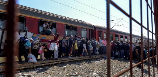 Migrants and refugees board a train heading to the border with Serbia, near the town of Gevgelija, The Former Yugoslav Republic of Macedonia, 13 September 2015. The Gevgelija-Presevo journey is just a part of the journey that the refugees, the vast majority of them from Syria, are forced to make along the so-called Balkan corridor, which takes them from Turkey, across Greece, Macedonia and Serbia.