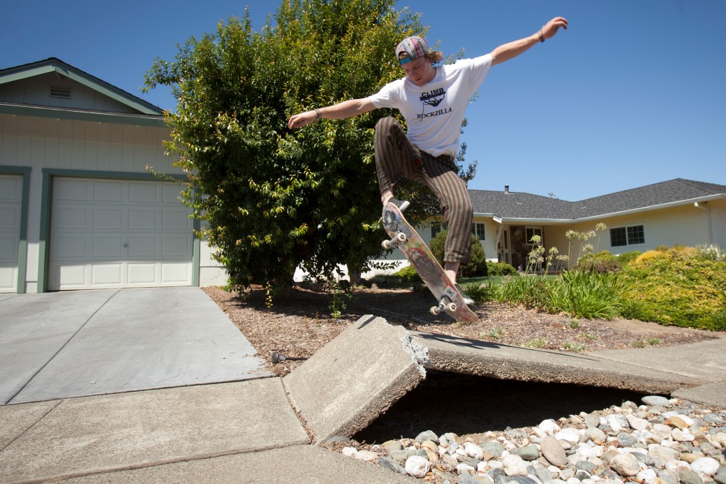 epa04366850 A skater took advantage of a buckled street after a 6.1 magnitude earthquake hit the San Francisco Bay Area, in Napa, California, USA, 24 August 2014. More than 70 people were sent to hospital with injuries and power outages darkened multiple cities in northern California after a 6.1-magnitude earthquake struck early on 24 August. The United States Geological Survey (USGS) said the earthquake struck at 3:20 am (1020 GMT) at a depth of 10.8 kilometres. It was located nine kilometres south-west of the Napa wine region, and 81 kilometres north of San Francisco. EPA/PETER DaSILVA