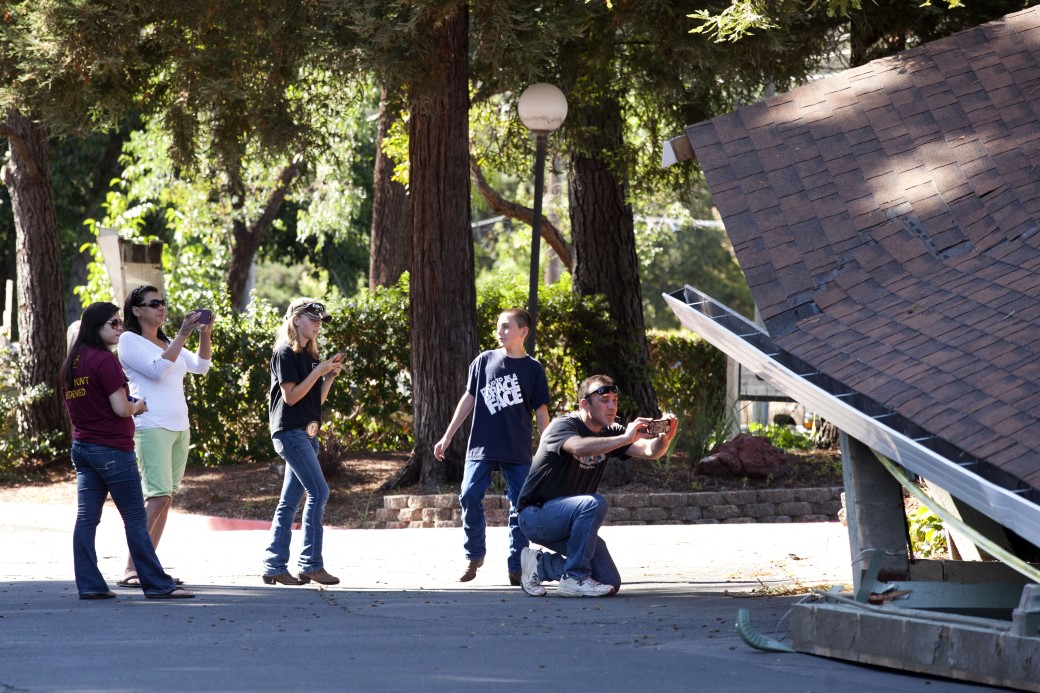 epa04366897 A family stop to take pictures of a collapsed carport at the Charter Oaks apartments after a 6.1 magnitude earthquake hit the San Francisco Bay Area, in Napa, California, USA, 24 August 2014. More than 70 people were sent to hospital with injuries and power outages darkened multiple cities in northern California after a 6.1-magnitude earthquake struck early on 24 August. The United States Geological Survey (USGS) said the earthquake struck at 3:20 am (1020 GMT) at a depth of 10.8 kilometres. It was located nine kilometres south-west of the Napa wine region, and 81 kilometres north of San Francisco. EPA/PETER DaSILVA