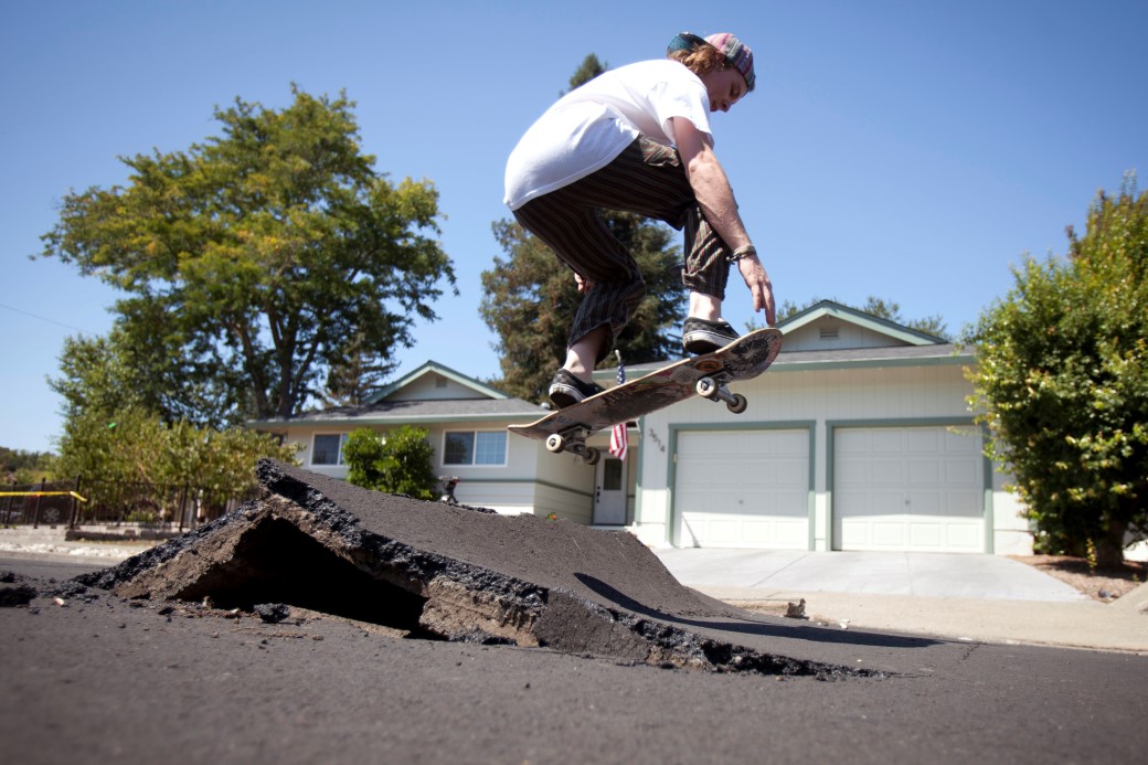 epaselect epa04366853 A skater took advantage of a buckled street after a 6.1 magnitude earthquake hit the San Francisco Bay Area, in Napa, California, USA, 24 August 2014. More than 70 people were sent to hospital with injuries and power outages darkened multiple cities in northern California after a 6.1-magnitude earthquake struck early on 24 August. The United States Geological Survey (USGS) said the earthquake struck at 3:20 am (1020 GMT) at a depth of 10.8 kilometres. It was located nine kilometres south-west of the Napa wine region, and 81 kilometres north of San Francisco. EPA/PETER DaSILVA
