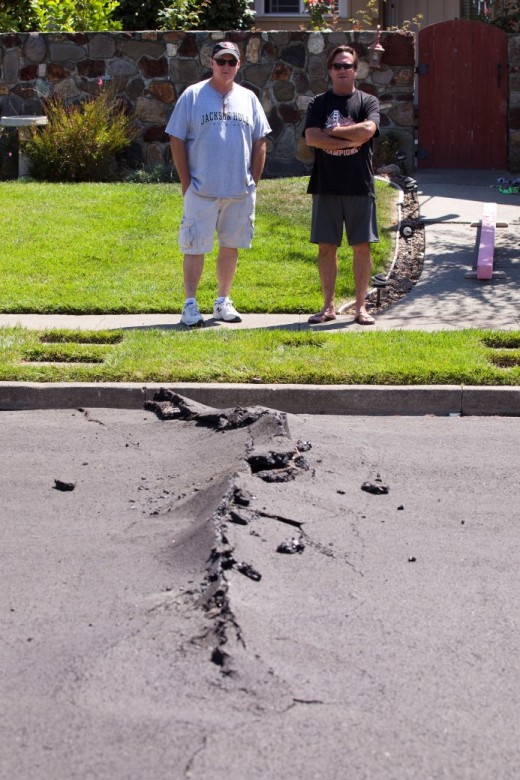 epa04366855 Napa residents survey a buckled street in a residential neighborhood after a 6.1 magnitude earthquake hit the San Francisco Bay Area, in Napa, California, USA, 24 August 2014. More than 70 people were sent to hospital with injuries and power outages darkened multiple cities in northern California after a 6.1-magnitude earthquake struck early on 24 August. The United States Geological Survey (USGS) said the earthquake struck at 3:20 am (1020 GMT) at a depth of 10.8 kilometres. It was located nine kilometres south-west of the Napa wine region, and 81 kilometres north of San Francisco. EPA/PETER DaSILVA
