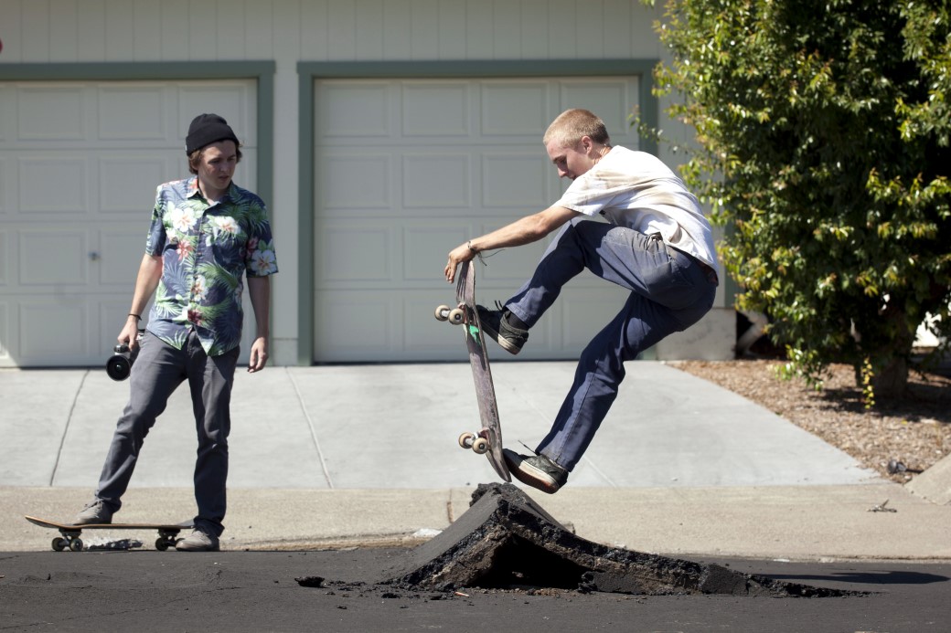 epa04366860 Skater Gabe Haugen (R) of Napa took advantage of a buckled street after a 6.1 magnitude earthquake hit the San Francisco Bay Area, in Napa, California, USA, 24 August 2014. More than 70 people were sent to hospital with injuries and power outages darkened multiple cities in northern California after a 6.1-magnitude earthquake struck early on 24 August. The United States Geological Survey (USGS) said the earthquake struck at 3:20 am (1020 GMT) at a depth of 10.8 kilometres. It was located nine kilometres south-west of the Napa wine region, and 81 kilometres north of San Francisco. EPA/PETER DaSILVA