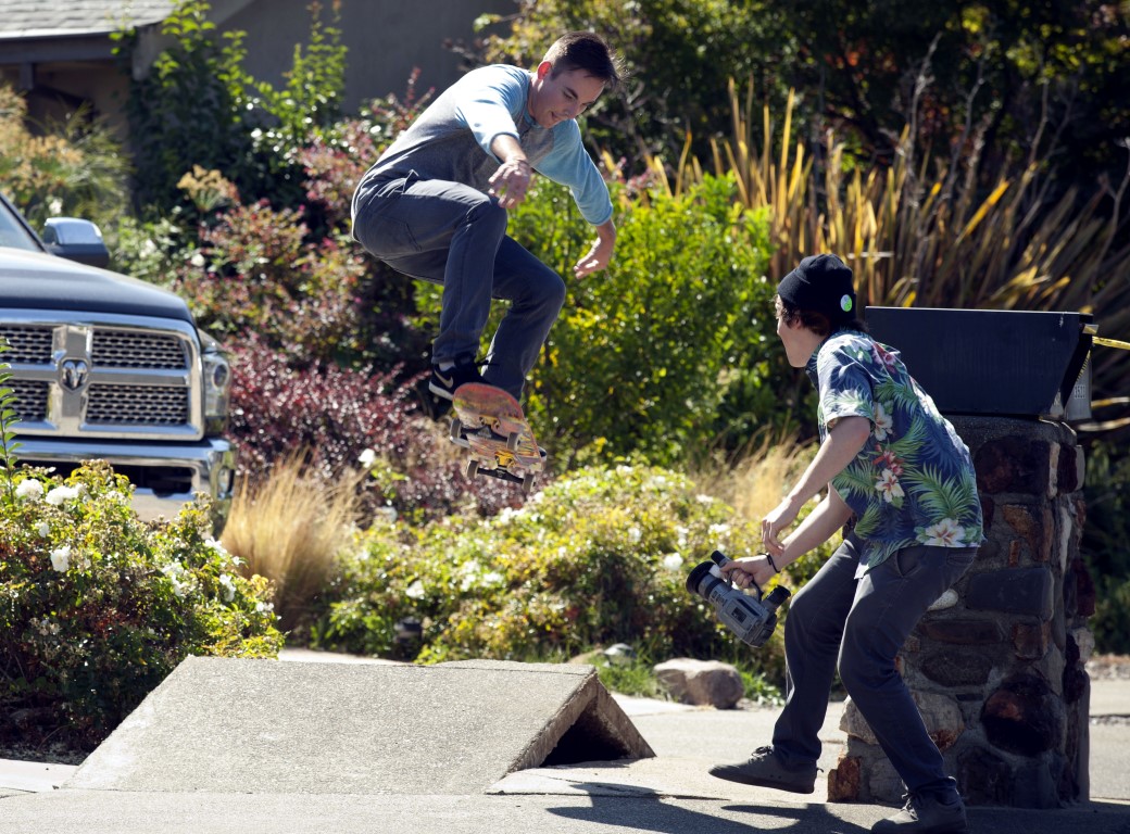 epa04366861 Skater Spenser Lucas (L) with cameraman Cody Hermann take advantage of a buckled sidewalk after a 6.1 magnitude earthquake hit the San Francisco Bay Area, in Napa, California, USA, 24 August 2014. More than 70 people were sent to hospital with injuries and power outages darkened multiple cities in northern California after a 6.1-magnitude earthquake struck early on 24 August. The United States Geological Survey (USGS) said the earthquake struck at 3:20 am (1020 GMT) at a depth of 10.8 kilometres. It was located nine kilometres south-west of the Napa wine region, and 81 kilometres north of San Francisco. EPA/PETER DaSILVA