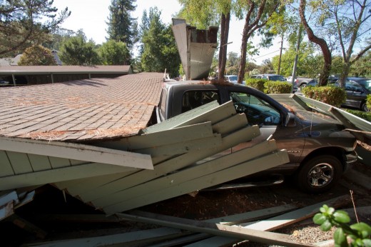 epa04366888 A truck damaged under a collapsed carport at the Charter Oaks apartments after a 6.1 magnitude earthquake hit the San Francisco Bay Area, in Napa, California, USA, 24 August 2014. More than 70 people were sent to hospital with injuries and power outages darkened multiple cities in northern California after a 6.1-magnitude earthquake struck early on 24 August. The United States Geological Survey (USGS) said the earthquake struck at 3:20 am (1020 GMT) at a depth of 10.8 kilometres. It was located nine kilometres south-west of the Napa wine region, and 81 kilometres north of San Francisco. EPA/PETER DaSILVA