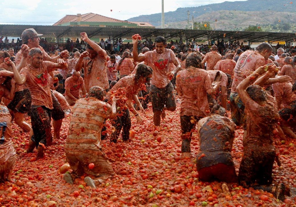 epa04235994 Hundreds of people participate in the eighth edition of the Tomatina in the locality of Sutamarchan, 170 km north of Bogota, Colombia, 01 June 2014. The Tomatina, which celebrates the harvest of tomatoes, is inspired in the well-known festival from Bunol, Spain, where participants throw tomatoes to each other. EPA/LEONARDO MUNOZ